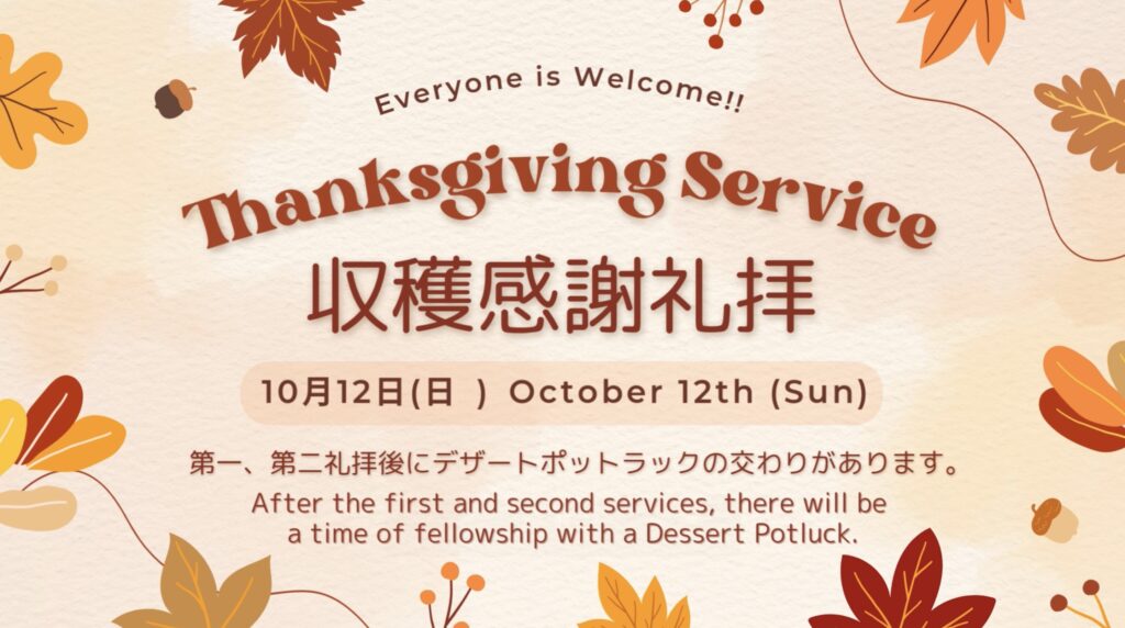 *毎週日曜日に教会にて、9時(日本語のみ)、11時30分(日英バイリンガル)、2時(日英バイリンガル)の3回、主日礼拝が行われています。どなたでもお越し下さい。